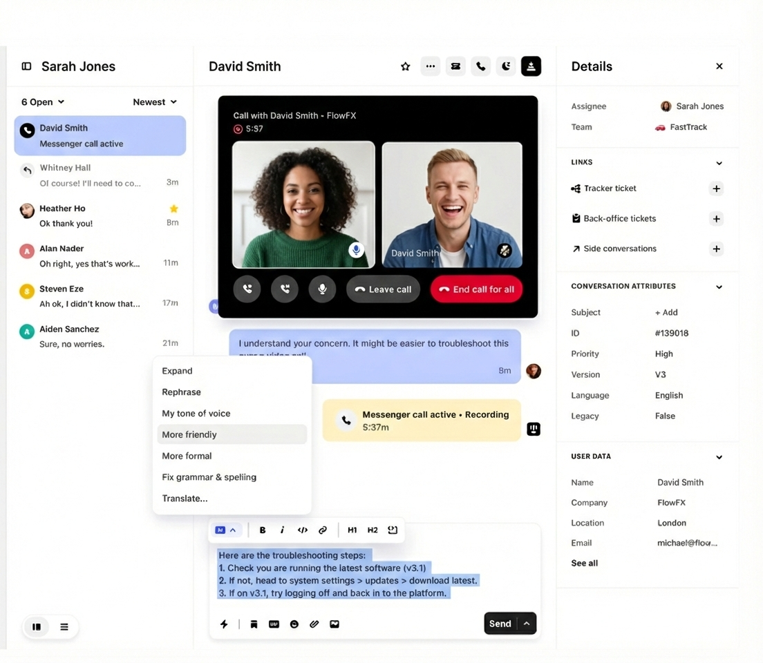 Reduce context switching, improve productivity, and accelerate resolution times. The workspace provides real-time AI assistance, suggesting responses, surfacing relevant knowledge, and automating repetitive tasks so agents can focus on solving complex issues.